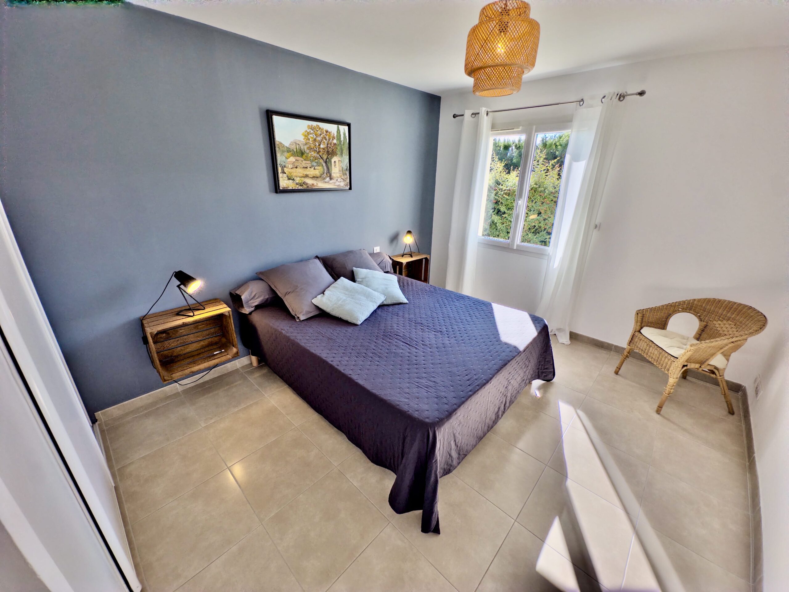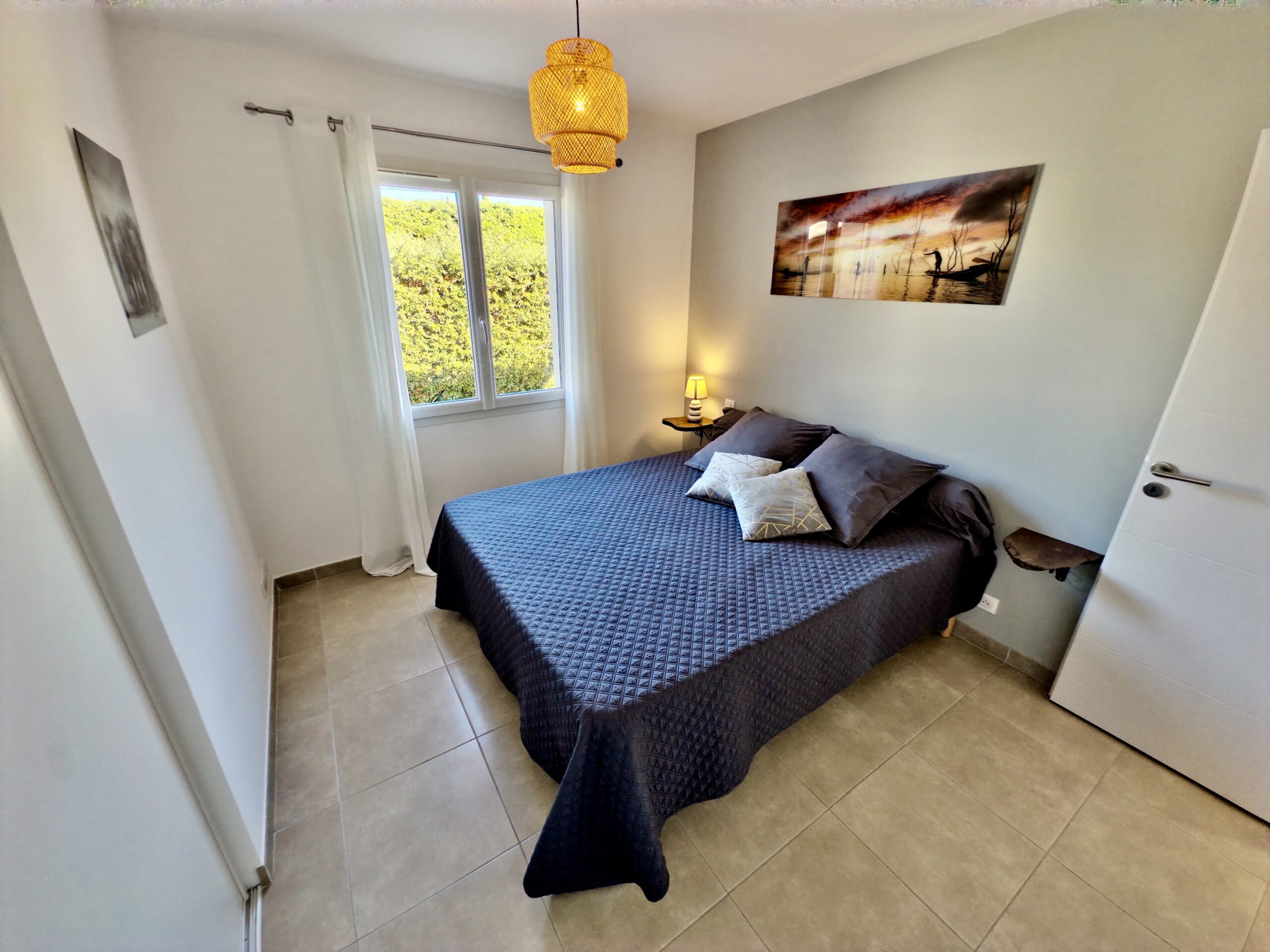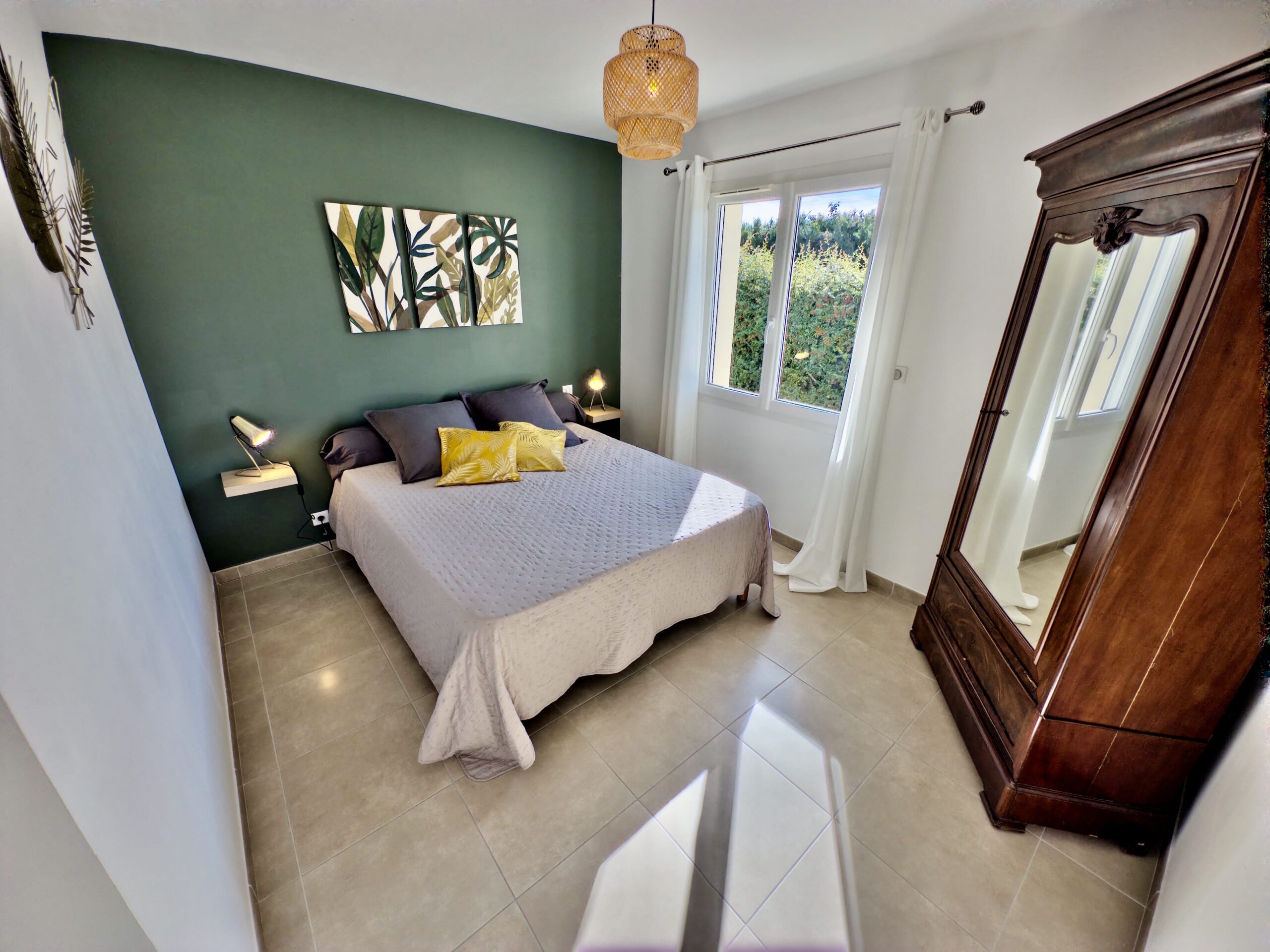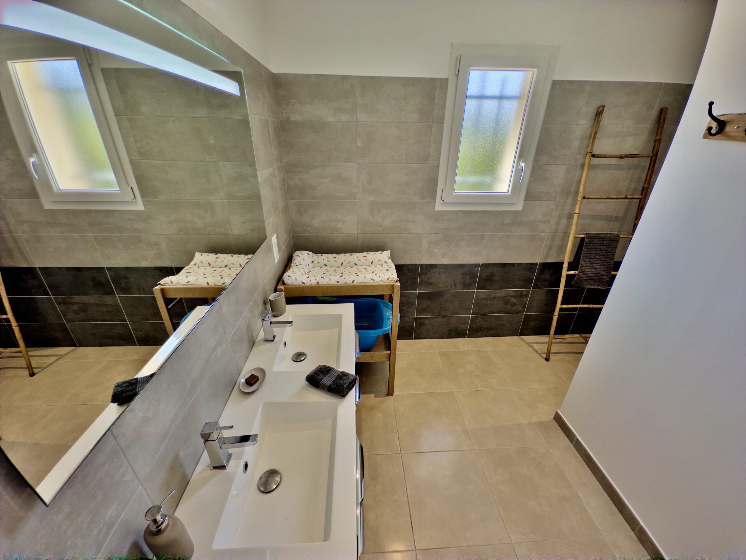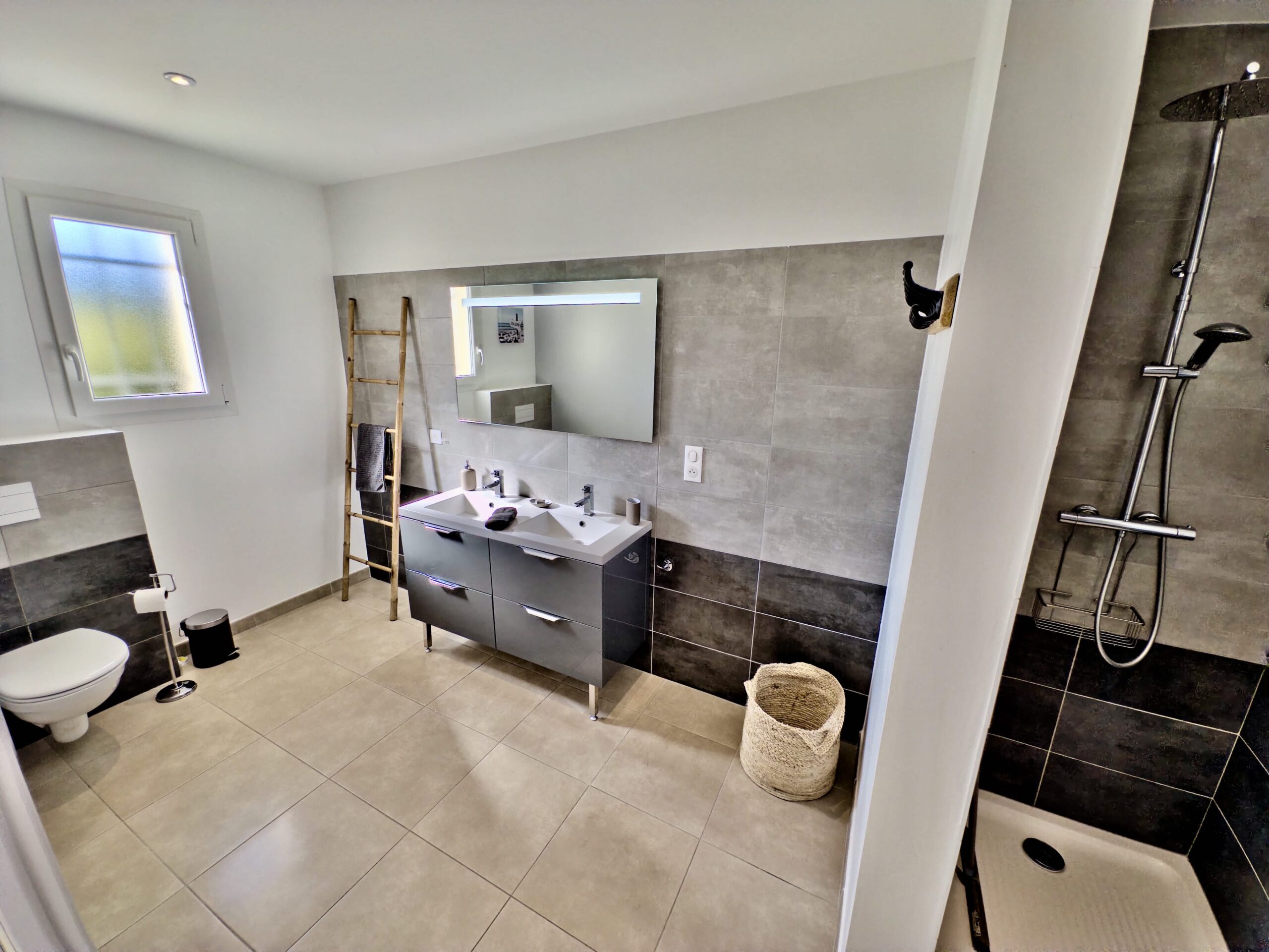 Chambre double lumineuse et élégante, pensée pour le confort et la détente. Elle dispose d’un grand placard et bénéficie d’un accès direct à une salle de bain située à proximité, équipée d’une douche à l’italienne, d’une double vasque et de toilettes.