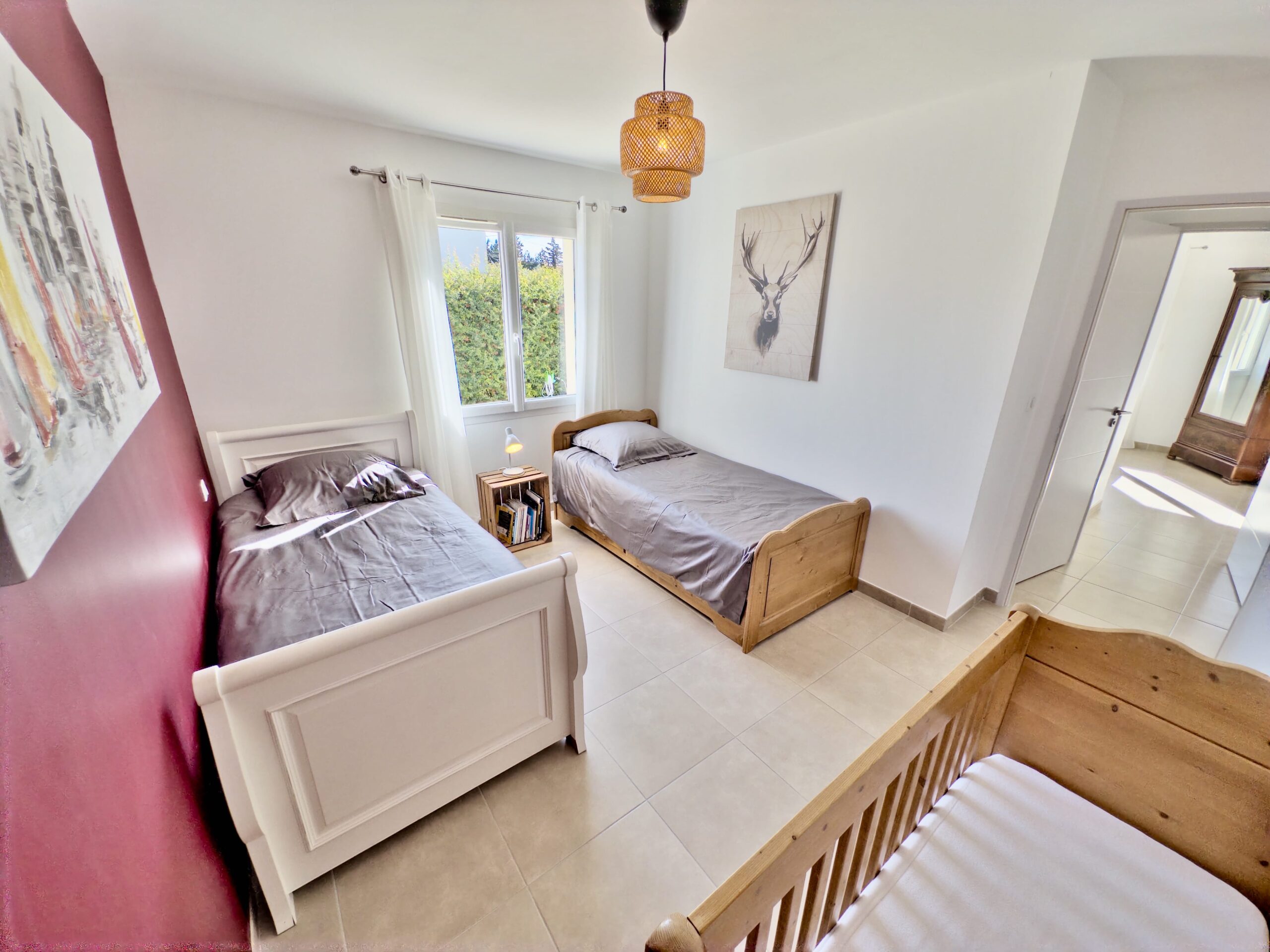 Chambre spacieuse et lumineuse idéale pour les familles, équipée de deux lits simples et d’un lit pour bébé. Son aménagement chaleureux et pratique en fait un espace confortable pour petits et grands.