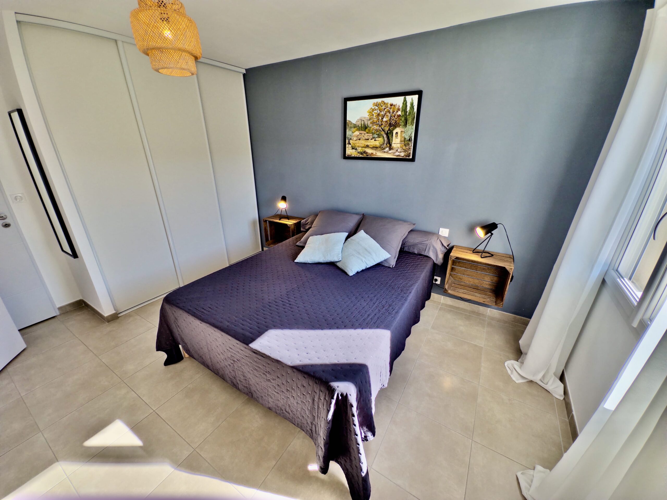 Chambre double au design soigné et lumineux, offrant un bel espace de rangement grâce à son grand placard. Elle dispose d’une salle d’eau moderne équipée d’une douche à l’italienne, d’un double lavabo et de toilettes pour un confort optimal.
